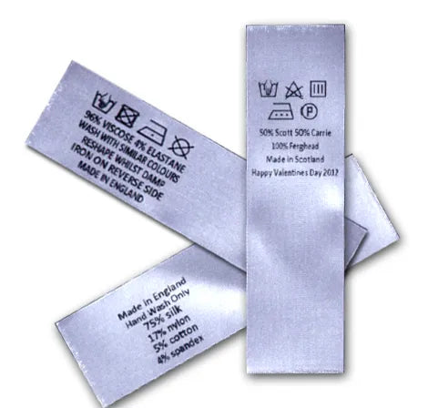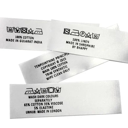 Our satin wash care labels are designed to ensure that your customers give proper care to your garments. The International Textile Care Labelling Code is a system of labelling which has been designed to standardise instructions for care of textile articles. We are able to print up to five symbols and an additional 5 lines of text.