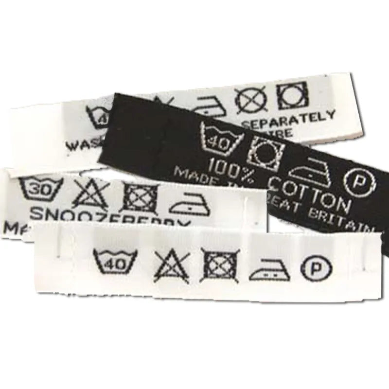 Our woven wash care labels are designed to ensure that your customers give proper care to your garments. The International Textile Care Labelling Code is a system of labelling which has been designed to standardise instructions for care of textile articles. We are able to weave up to five symbols and an additional two lines of text.